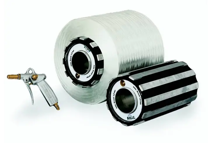 Unsere pneumatischen Spulenadapter können auf allen gängigen 3-Zoll-Spulenwellen montiert werden. Die Außenseite besteht aus einem strapazierbaren Gummi, der sich durch das Befüllen mit Druckluft gleichmäßig ausdehnt. Darauf angebracht befinden sich Aluminiumleisten, welche die von Ihnen gewählte Spule klemmen.