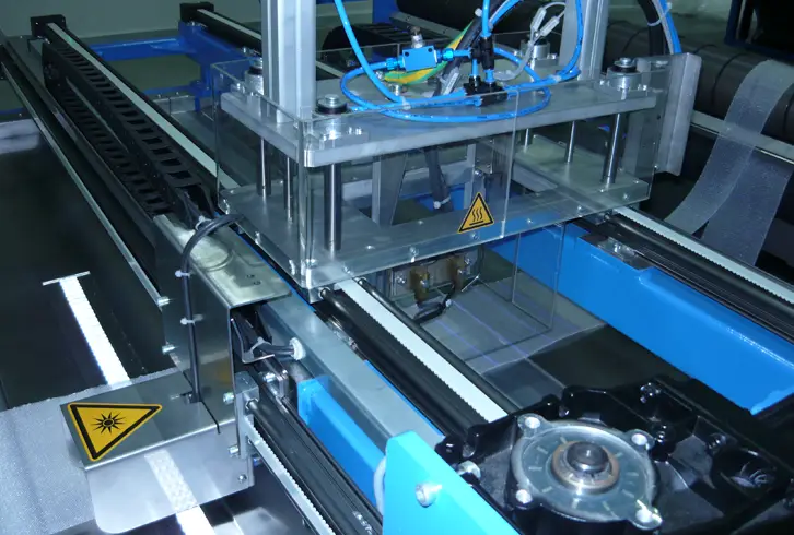 Hier sehen Sie eine mobile Anlage zum vollautomatischen Ablängen von Textilbahnen mit keilförmigem An-und Abschnitt in Vorbereitung auf den Bonding Prozess. Die Bahnspannung kann frei gewählt werden und das Gewebe kann mittels bahnkantengesteuertem Drucker mit UV-Tinte bedruckt werden.
